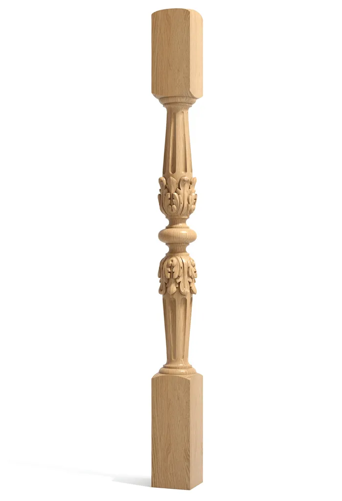 Столб деревянный для лестницы L-073 отличается своей резьбой, которая выполнена с большим мастерством и аккуратностью. Резьба представляет собой изысканный и элегантный орнамент, который состоит из геометрических и растительных мотивов. Резьба придает столбу объем и рельеф, а также создает игру света и тени на деревянной поверхности. Резьба также подчеркивает стиль и характер столба, который можно отнести к модерному или арт-деко направлению.