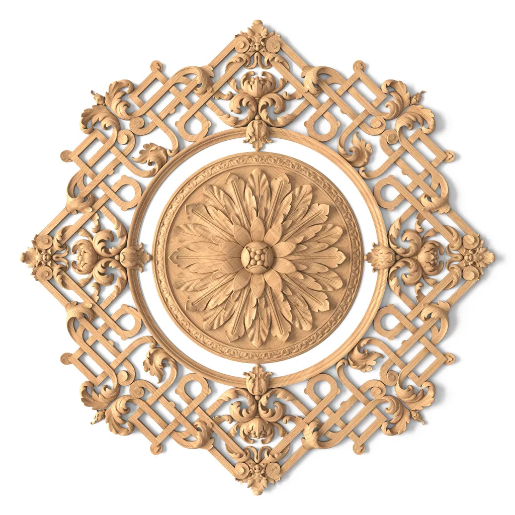 Резная розетка R-071 — это уникальный декоративный элемент, который выполняется из цельного куска дерева. Используя традиционные приемы резьбы по дереву, мастера интерьерного декора тщательно прорабатывают каждый узор, делая акцент на мельчайших деталях. Розетка представляет собой сложное переплетение геометрических и растительных мотивов, символизирующих природную и архитектурную гармонию.