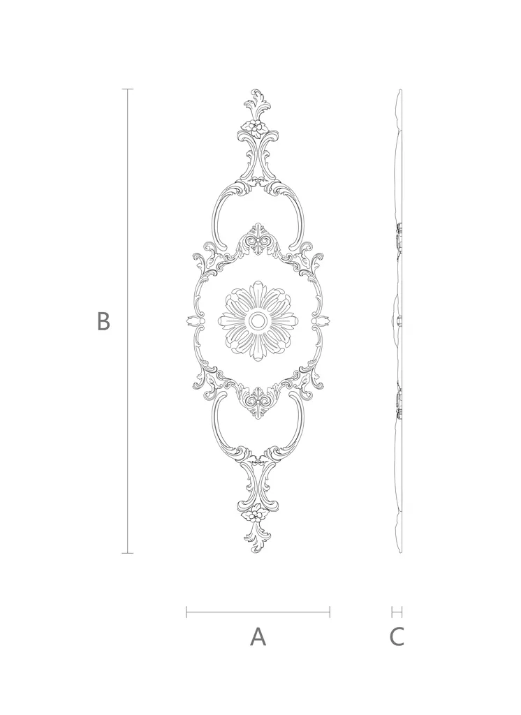 ● Carved Inlay N-433R. This element is adorned with a carved ornament of leaves and flowers, creating a three-dimensional and relief effect. The inlay is suitable for decorating the right side of the side of furniture, doors, windows, fireplaces, arches, etc.