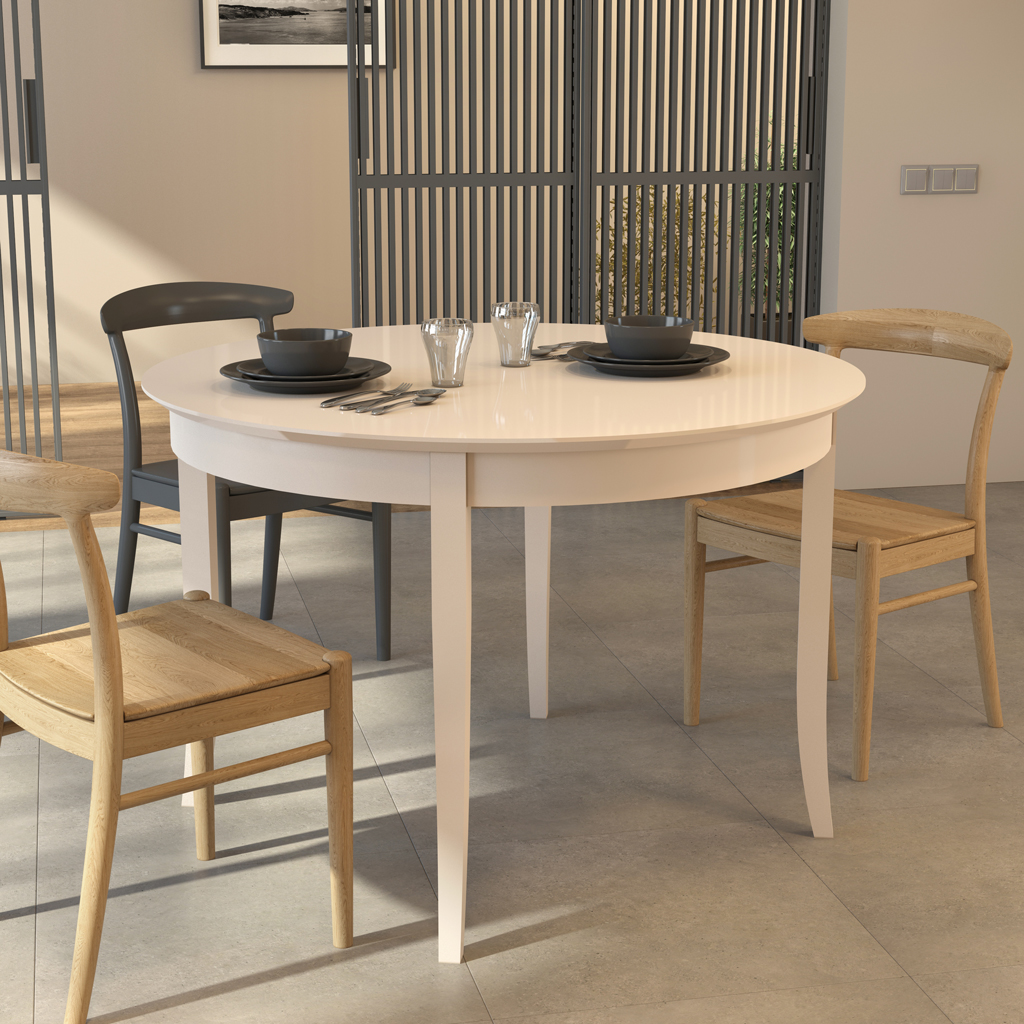 Round table shape, option to choose finish (enamel or staining), and optimal dimensions. - Thoughtful construction.