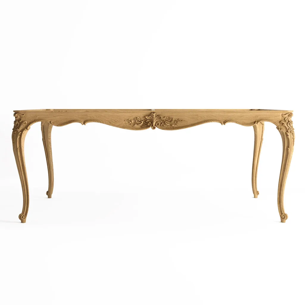 The table is functional, designed for long-term use, and can be made from solid beech or oak. Curved cabriole S-shaped legs form a unified decorative composition with ornate carved motifs. The table's decoration consists of combinations of acanthus leaves, geometric straps, stylized rocaille, and flower buds. The table's construction is designed for heavy loads, and even heavy stone slabs can be used as tabletops.