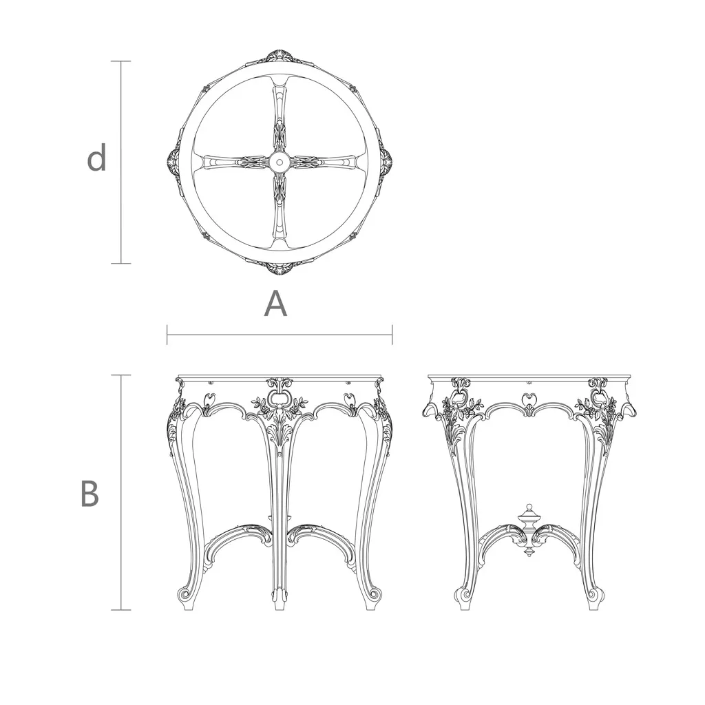 The construction of the elegant round table consists of four S-shaped cabriole legs with double bends, connected by curved carved stretchers. The lower part of the legs is joined by decorative C-shaped rails, which additionally provide rigidity to the entire structure. The STL-027 frame is designed for high loads. Heavy stone tops may be used.