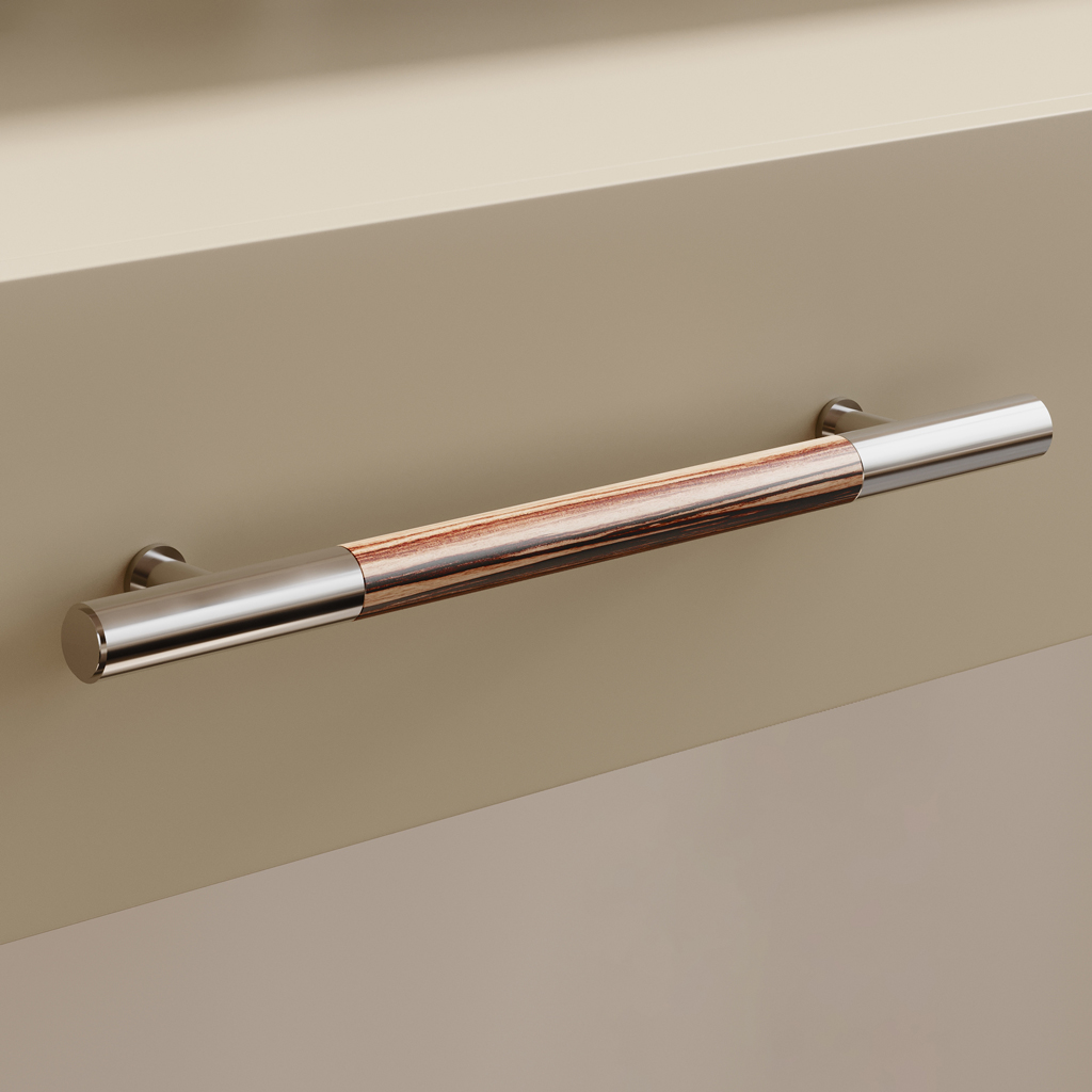 On the kitchen, the Oscar HL-061-1M handle not only performs its function, ensuring convenient opening of cabinets and drawers, but also adds a stylish look to the set. Its smooth wooden surface combined with metallic inserts makes it an excellent accent in modern or classic kitchens. The furniture handle highlights the style and adds elegance to the ambiance, making each element of the set unique. -
