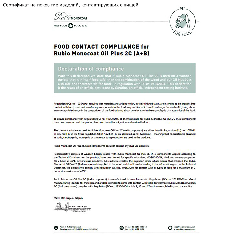 * Rubio Monocoat oil has a certificate for coating food-contact items, a certificate for coating wooden toys, and "Eurofins Indoor Air Comfort Gold" – a certificate meeting the strictest current emission requirements in Europe.
