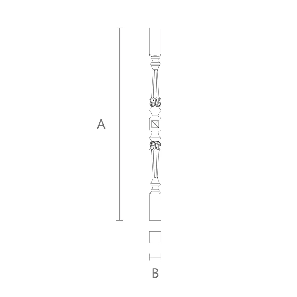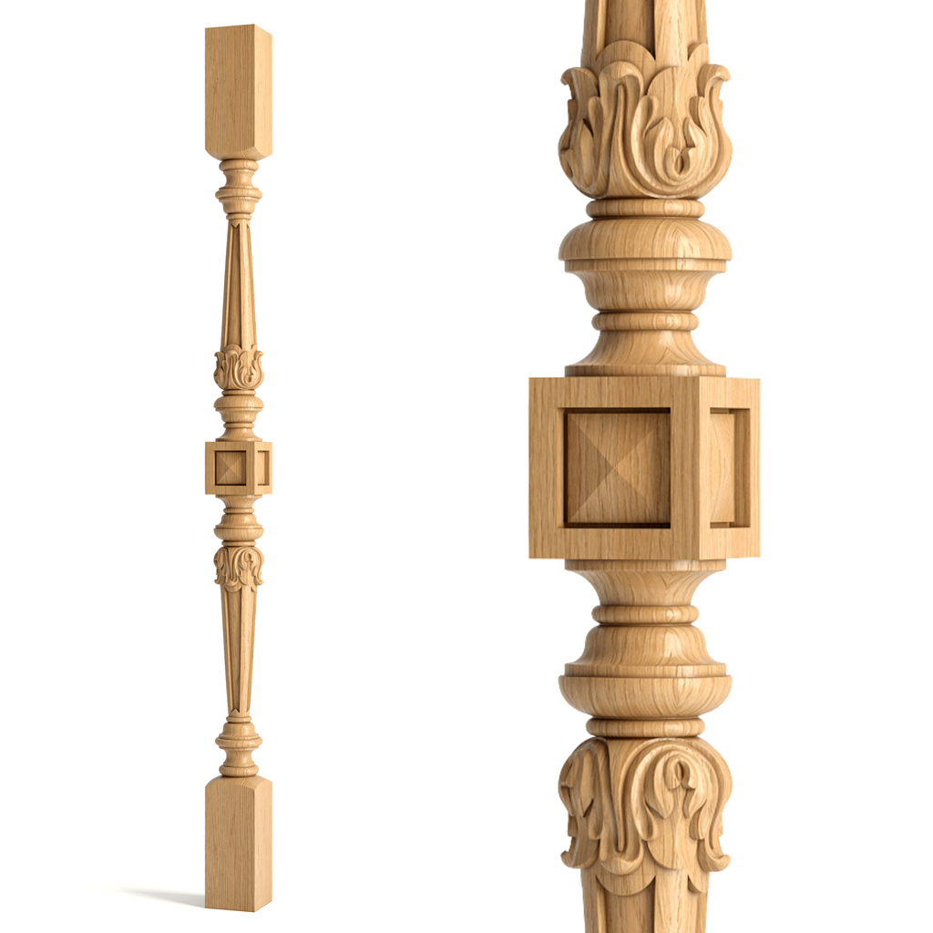 Model L-025 is an elegant wooden baluster with a symmetrical design. The baluster is adorned with a cube in the central part, as well as fluting and carved acanthus leaves. Such balusters will form an ideal composition with carved posts L-072.