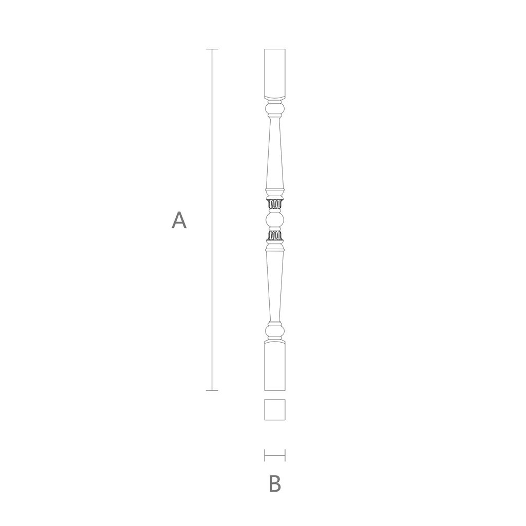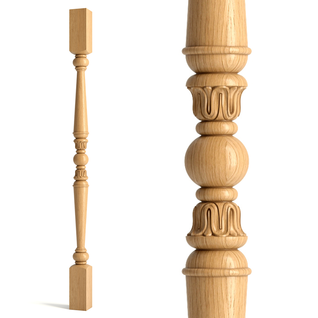 Staircase Baluster L-026 made of wood is a carved baluster with intricate detailing, crafted from oak or beech. Oak and beech are strong and hard wood species, distinguished by high strength and durability. These wood species also have beautiful texture and color, enhanced by varnish or oil. The wooden staircase baluster L-026 has a smooth and elegant shape, consisting of several parts: base, stem, head, and cap. On the stem balusters carving is applied, giving it originality and elegance. Carving can be of various types: geometric, floral, ornamental, etc. You can choose carving according to your taste and interior style.