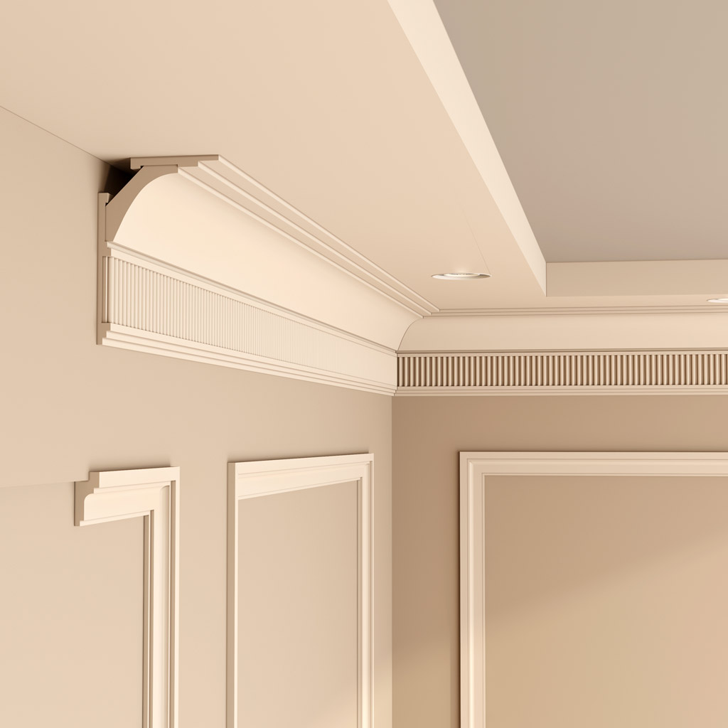 The frieze section is adorned with a decorative textured insert made of cast polyurethane. It is supplied not pre-installed into the frieze's recess. This allows for more precise painting of each part separately, covering them with different colors to achieve complex visual effects.