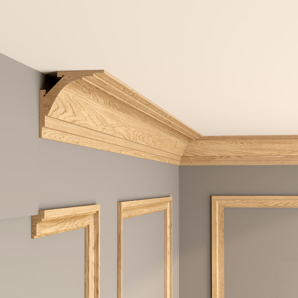 Combination with othermouldingsallows creating complex multi-level structures using the principles of the golden ratio. The oak version is especially effective when combined with natural materials — marble, granite, high-quality solid wood parquet.