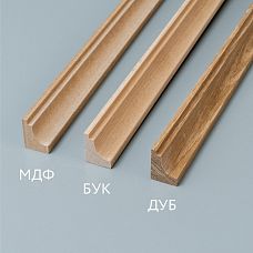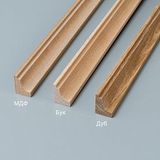 Oak MoldingExcellent for accepting water-based and organic stains while preserving the natural noble wood grain. Compact quarter-round section ensures uniform penetration of toning compounds across the entire delicate profile surface.Beech MoldingGuarantees uniform coloring in chamber color palette from natural honey tones to elegant brown and refined wenge tones.