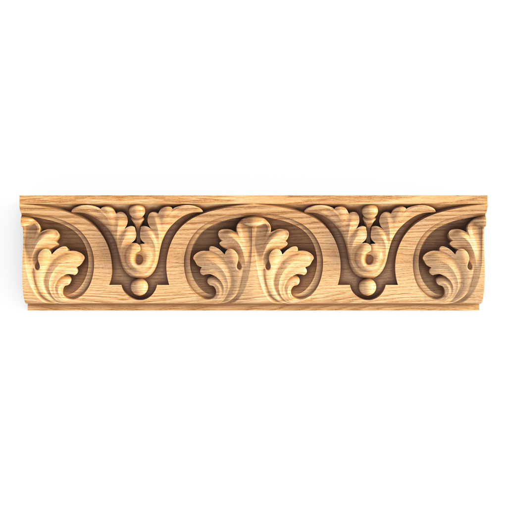 Central compositionThe molding K-030.01 is based on classical plant motifs, where stylized acanthus leaves and volute-like scrolls dominate. The ornament demonstrates high craftsmanship in wood carving, where each element is carefully worked and harmoniously combined with adjacent details.