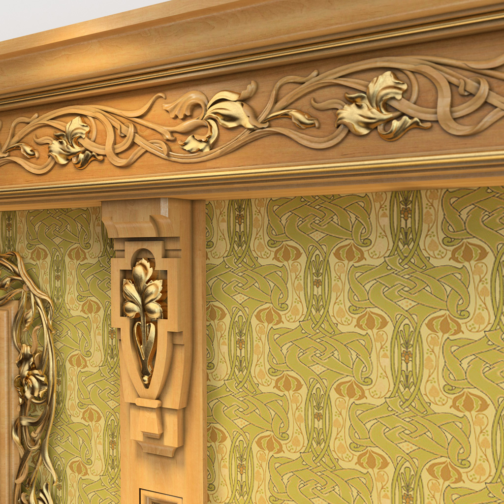 Decorative wooden molding K-060 — representative of the Art Nouveau style. Its delicate, intricate ornament with irises brings harmony to interiors and furniture, highlighting a unique taste. The Art Nouveau style concept — motifs of nature. It implies unity and consistency in selecting carved elements. The iris frieze can be used as a standalone decorative element for walls and ceilings. It is also often used as an elegant accent for kitchen facades, doors, cabinets, drawers, beds, and staircases.