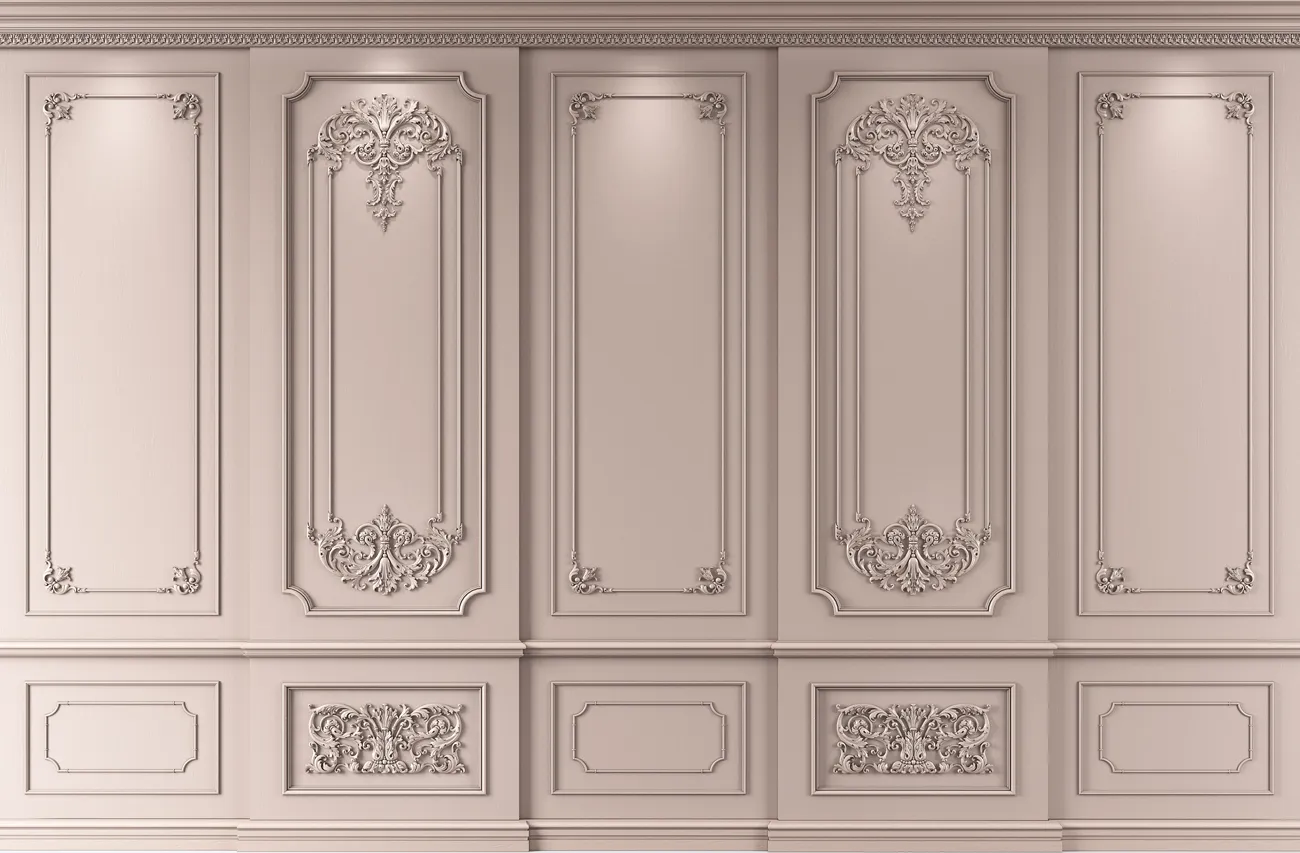 Combining various decorative details in wall decoration allows creating a visually rich and stylish interior. The composition includes carved appliqués, moldings, cornices, trim, baseboards, and additional corner elements, which ensure harmonious decoration and make walls truly expressive.