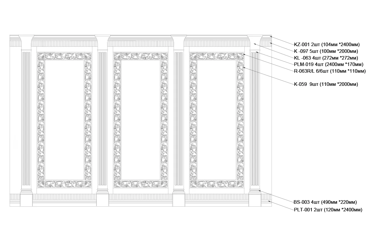 Project INT-016 was developed in accordance with classical principles of wall decoration, where rhythm, proportion, and volume are essential. Each element in this panel carries both functional and aesthetic significance, creating a unified architectural ensemble.