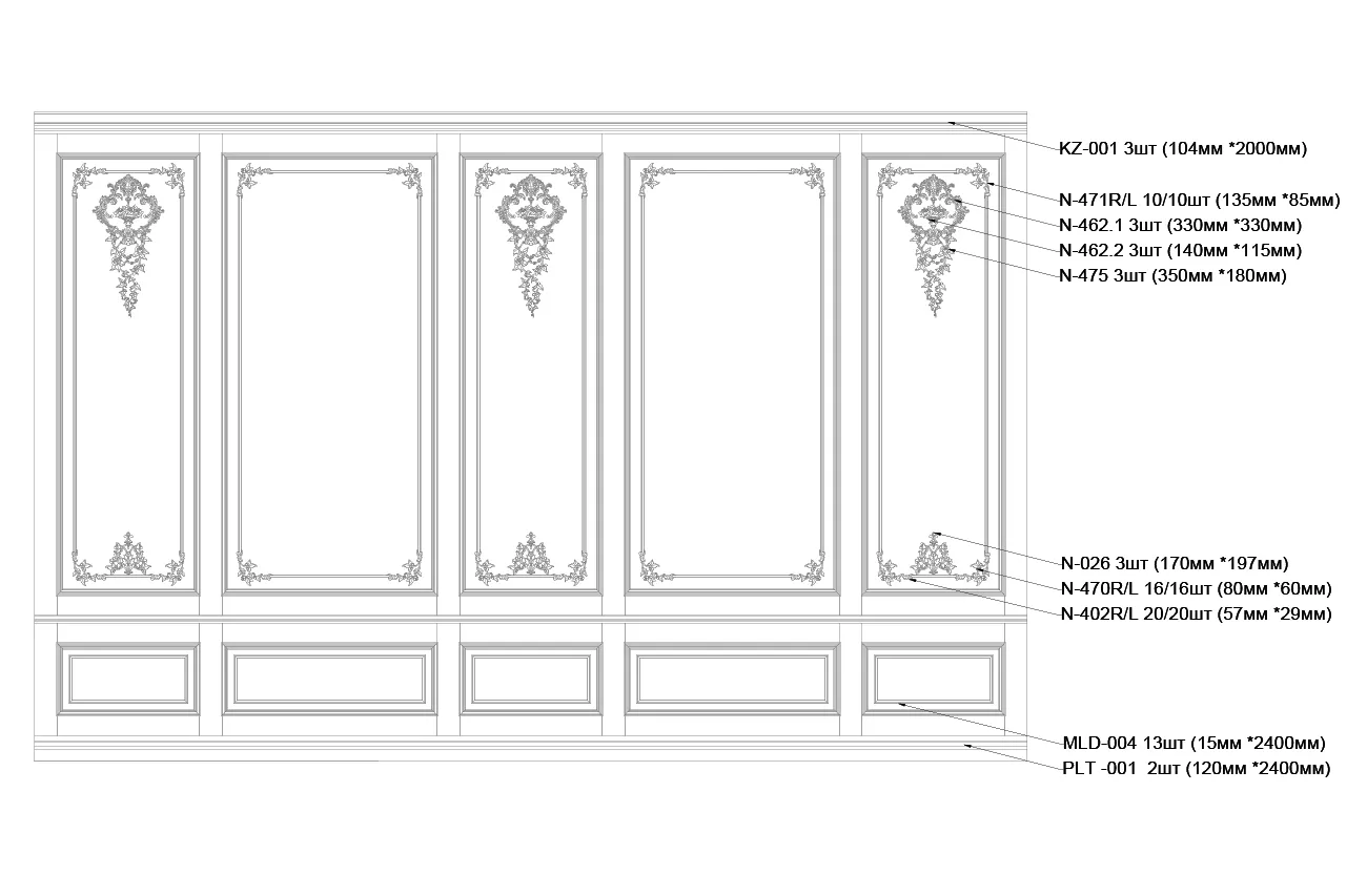 Carved appliqué N-026 is located at the bottom of wall panels, forming a complete image of the entire composition. This element does not merely complement the upper carved appliqués, but also creates a harmonious balance between decorative details.