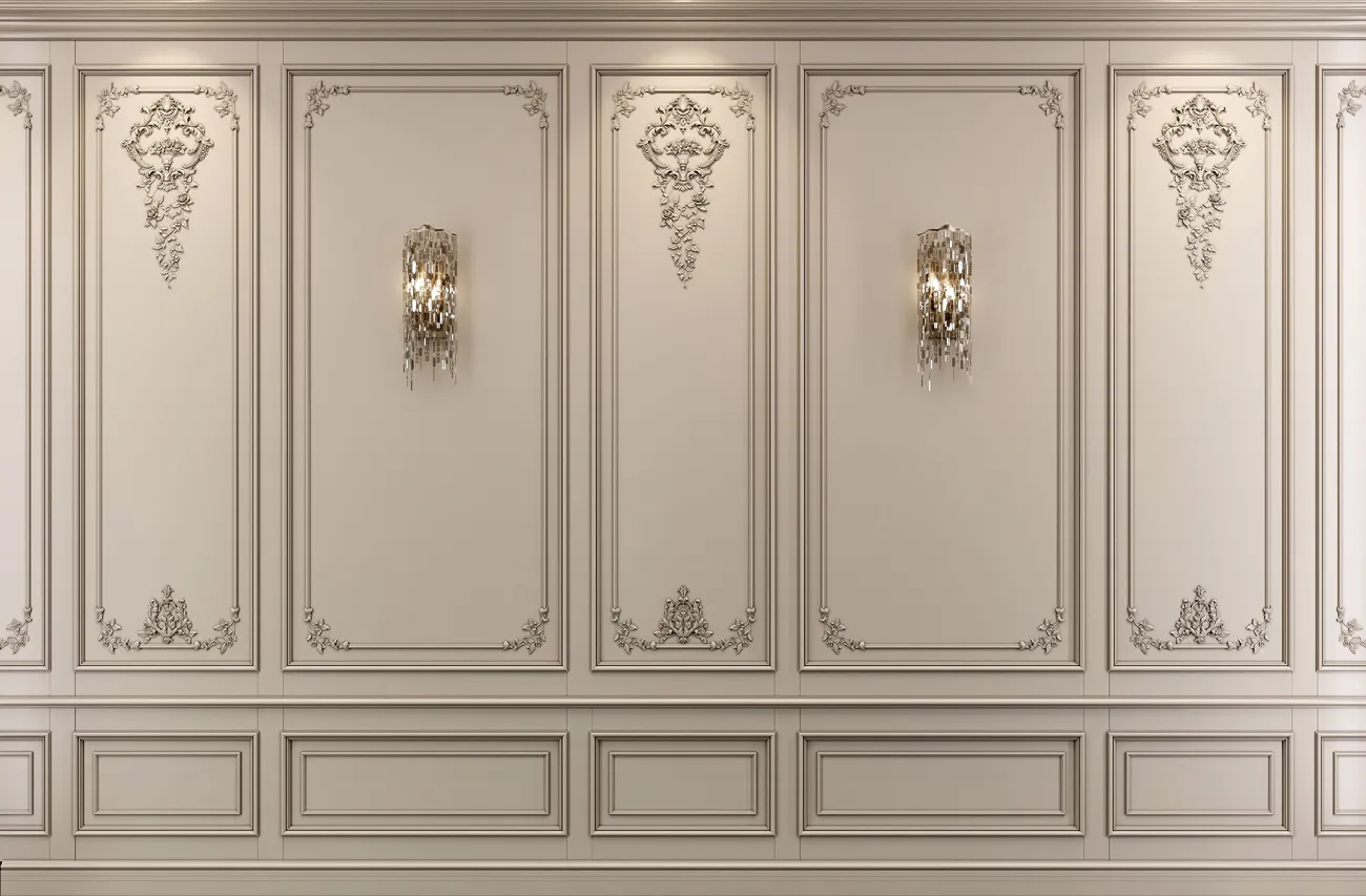 Moldings are used to decorate panel edges. They emphasize classical framed shapes, adding expressiveness to the wall. -
