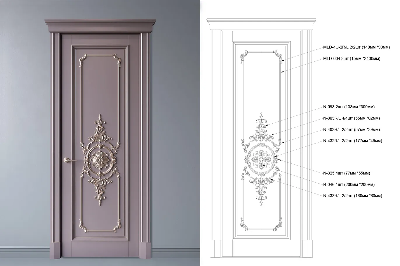 carved appliqué N-303L и carved appliqué N-303R are used to decorate the corners of the door, creating symmetry and harmony. These elements add refinement and elegance to the door’s design.