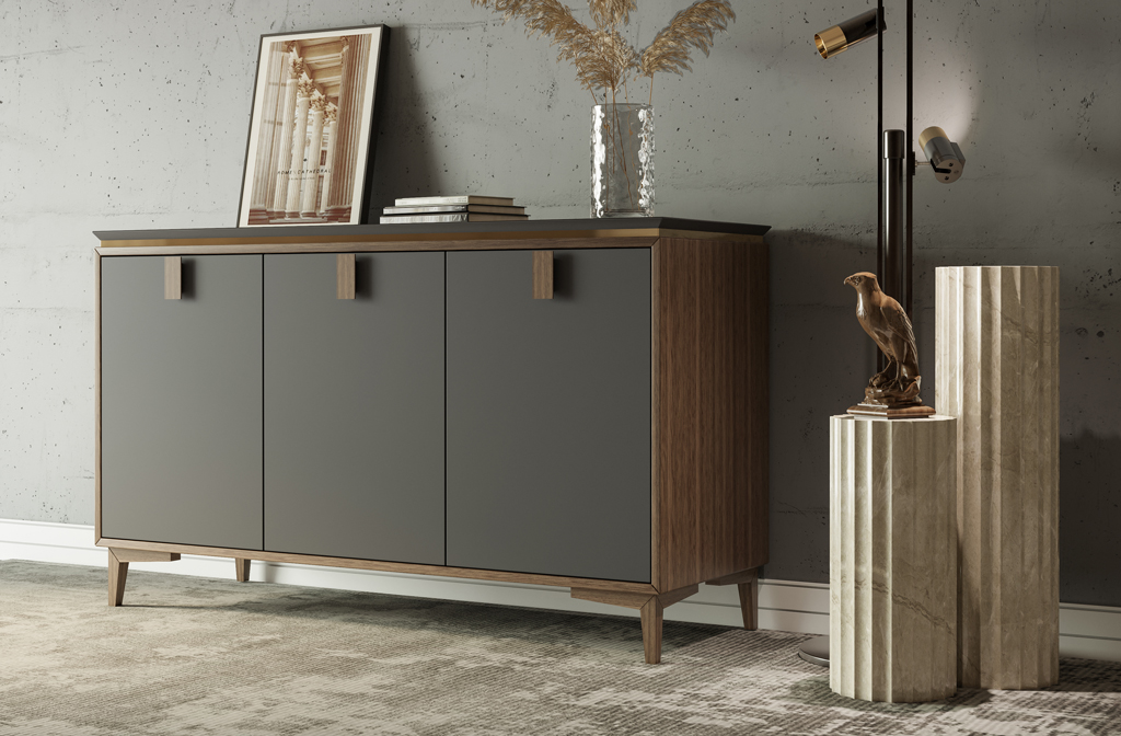 Chest KMD-018 is a embodiment of modern design, combining elegance, minimalism, and functionality. Its clean lines and thoughtful decoration make it an ideal addition to a modern-style interior. Key decorative elements, such as the furniture handle Plato HL-015 and geometric legs MN-209, highlight the refinement and sophistication of this piece. Special attention in this interior is also given to the use of the cap L-105 as a standalone decorative element, which gives the space a unique and finished look.
