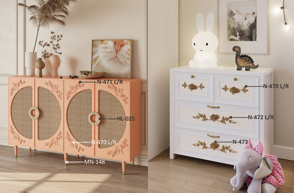 Decorating the chest KMD-029 is an art that requires attention to detail and a sense of style. Using carved inserts such as N-471R, N-471L, N-470R, N-470L, N-472R, N-472L, and N-473, in combination with elegant handles Solea HL-025 and refined legs MN-148-1, allows you to transform this chest into a true work of art that will become a decoration for any interior.