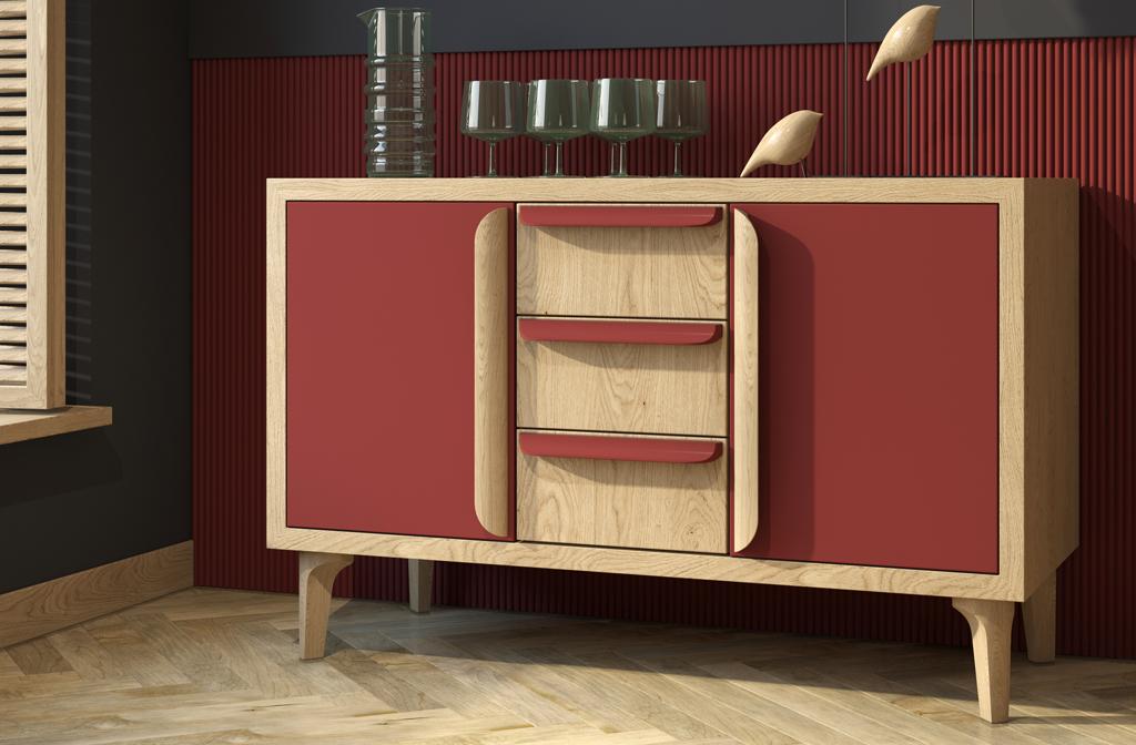 Playing with contrasts. Combine matte and glossy surfaces to create an interesting visual effect. For example, make the cabinet's facade matte, while the handles and legs glossy.