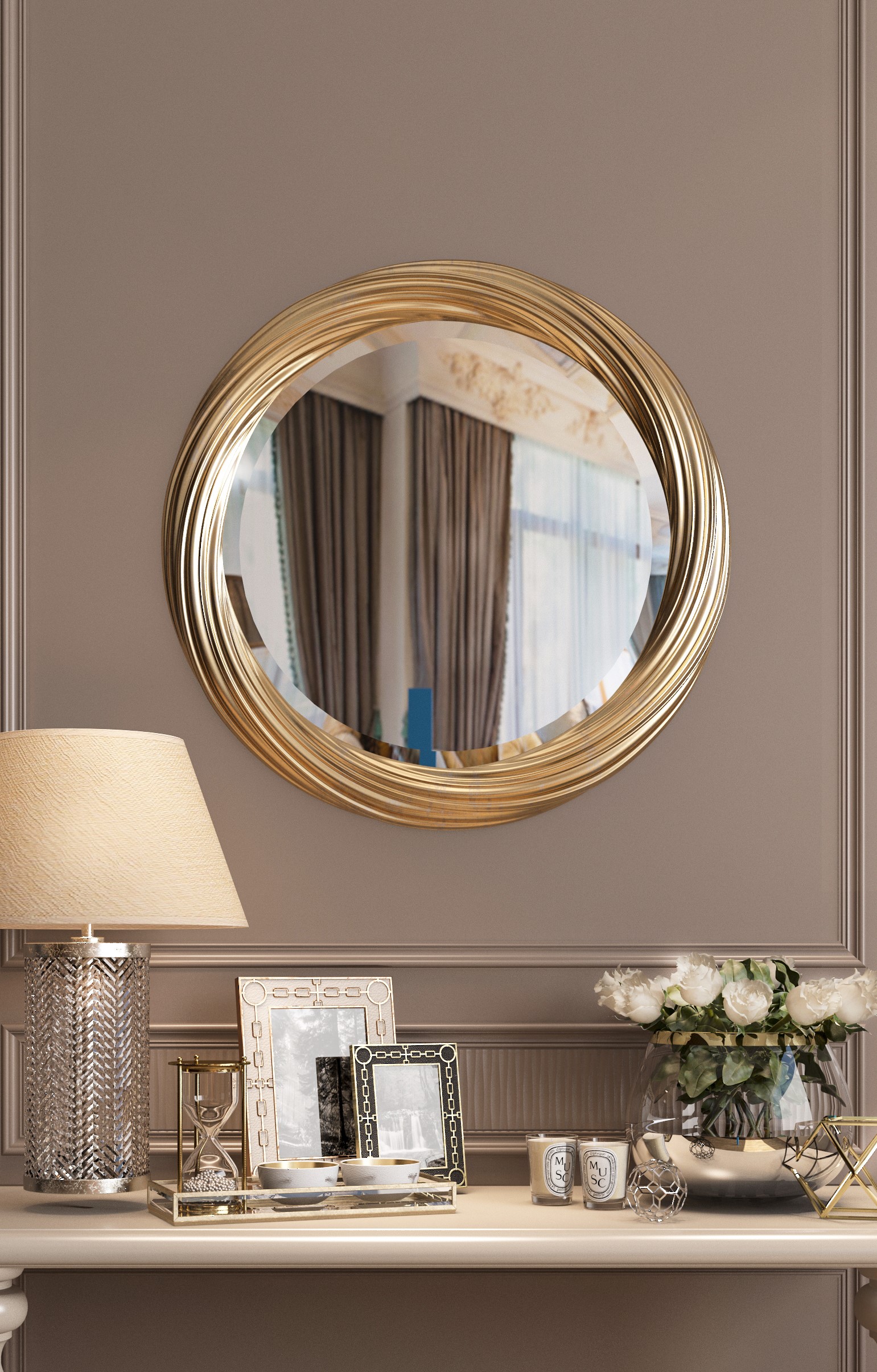 Such mirror frame perfectly suits refined interiors, where attention to detail plays a key role. Its rounded shape harmoniously fits into the ambiance, adding softness and fluidity to the space.
