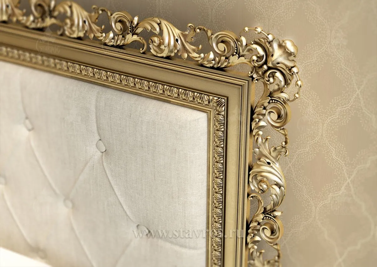 Bed KRV-001 embodies aristocratic style, where every detail is meticulously perfected. Its luxurious headboard, framed by intricately carved elements with delicate patterns, transports you to the era of palaces and royal chambers. Inspired by Baroque and Rococo art, this bed becomes not just the center of the bedroom, but a true work of art.