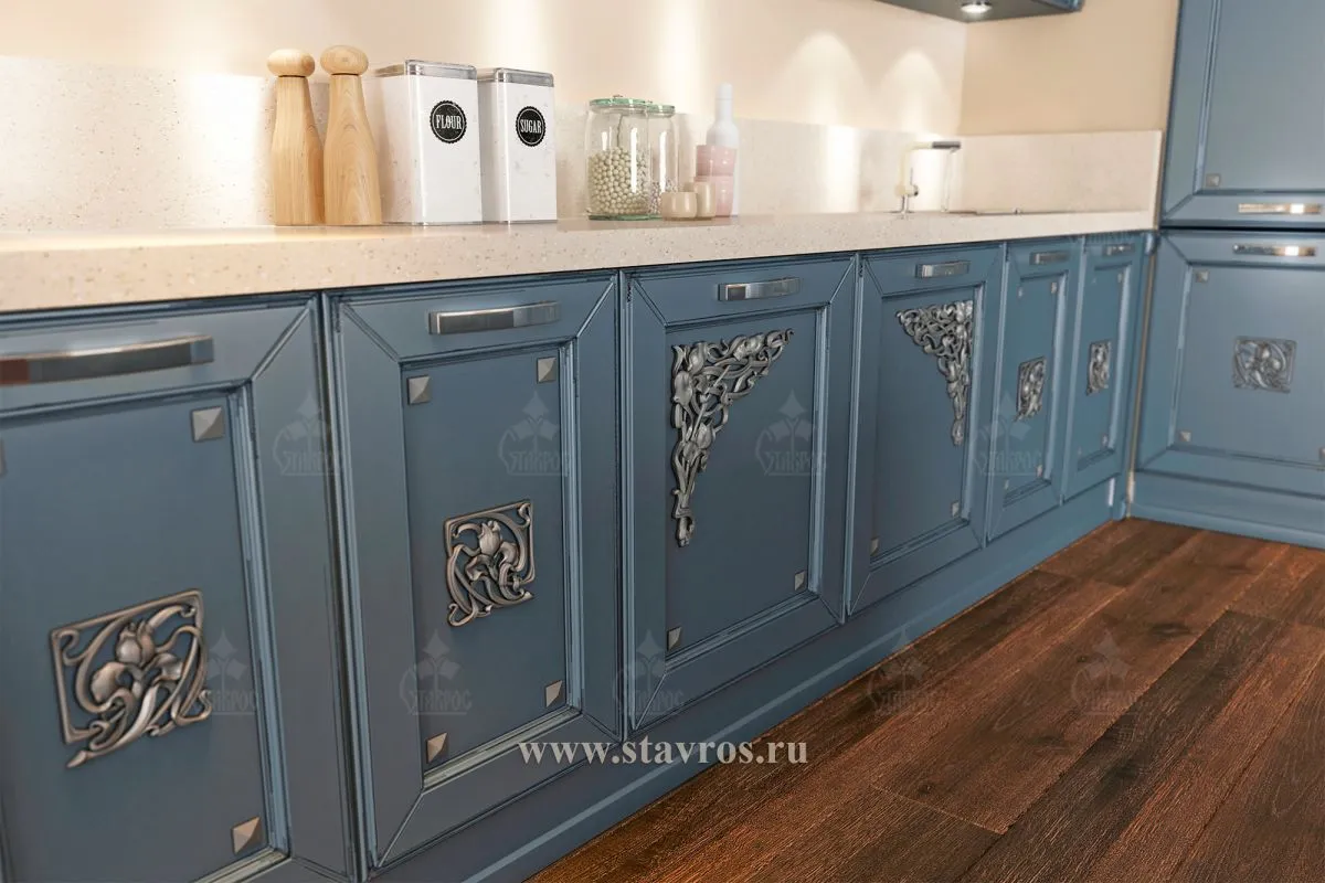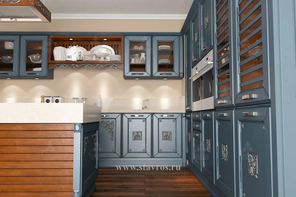 - Rich blue color of the cabinet fronts, executed in deep matte texture, adds nobility to the interior, while metallic accents with artistic carving emphasize the exclusivity of the design.