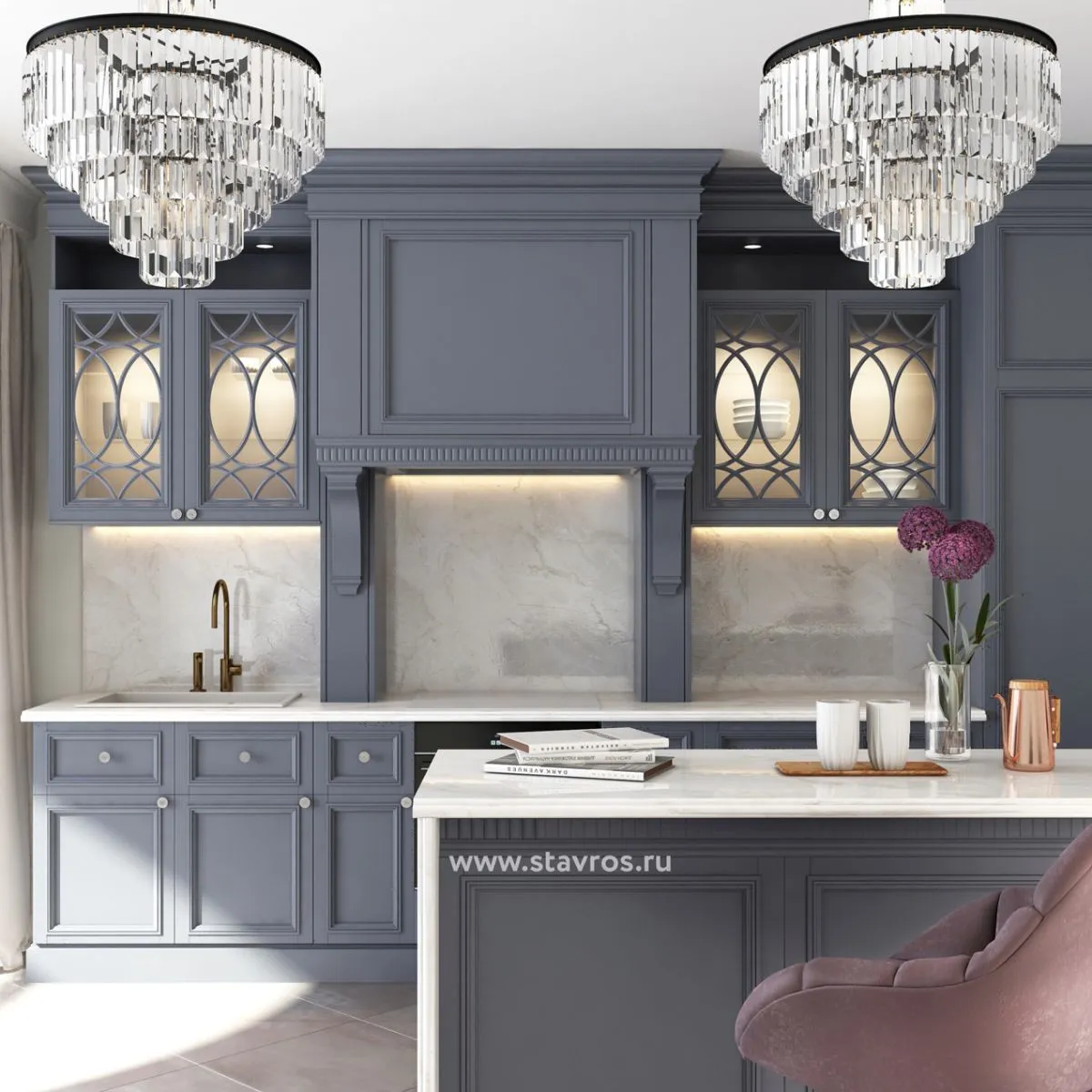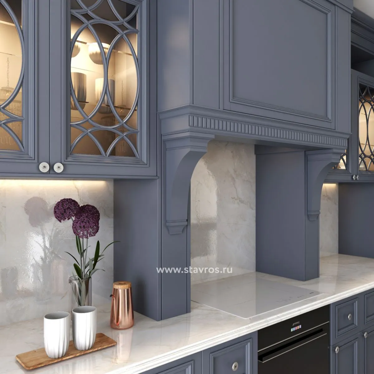 Marble plays an important role in the kitchen KUH-020 interior. It serves not merely as a background, but as a true central element that ties all decorative details together. The light tones of the stone create contrast with gray-blue facades, making the composition deeper and more expressive.