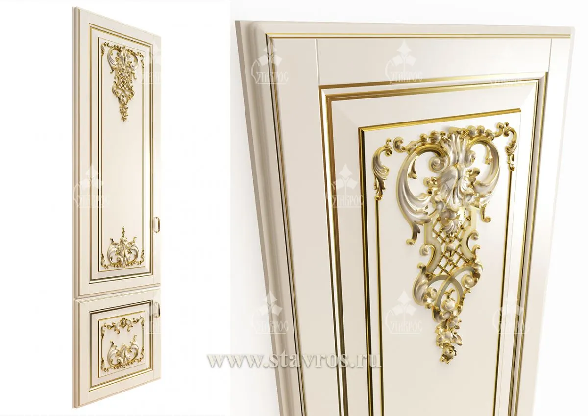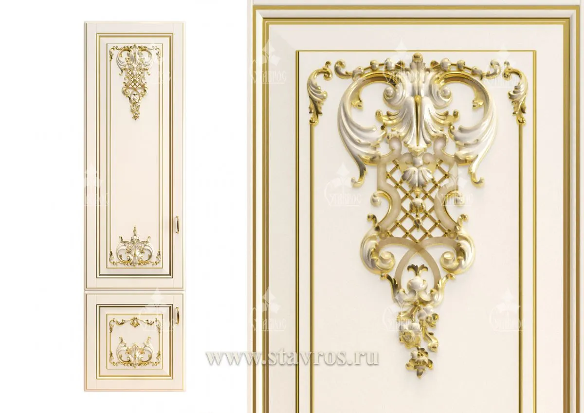 Gilded elements, symmetrical arrangement of carved details, and refined patterns give this facade a special chic and nobility, emphasizing its premium status. Such a facade is ideal for kitchens, buffets, wardrobes, classic cabinets, and antique commodes, giving furniture a luxurious and refined look.