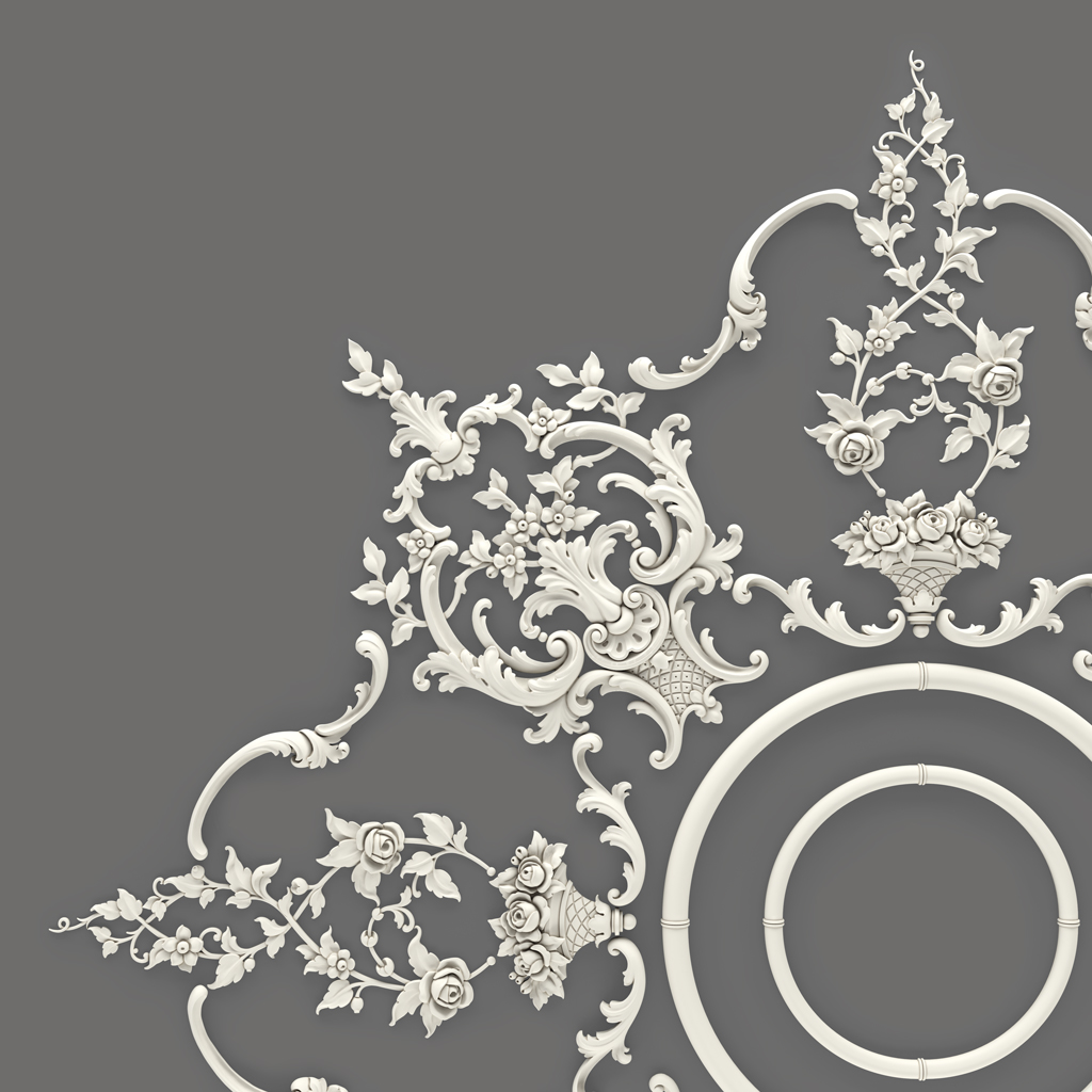 Decorative medallions MLDPU-027U of various sizes are placed at nodal points of the composition — at the intersections of axial lines, in the centers of the formed decorative sectors, in the gaps between large elements. Large medallions create secondary focal points, while small ones serve as connecting elements that ensure the visual unity of the entire composition.