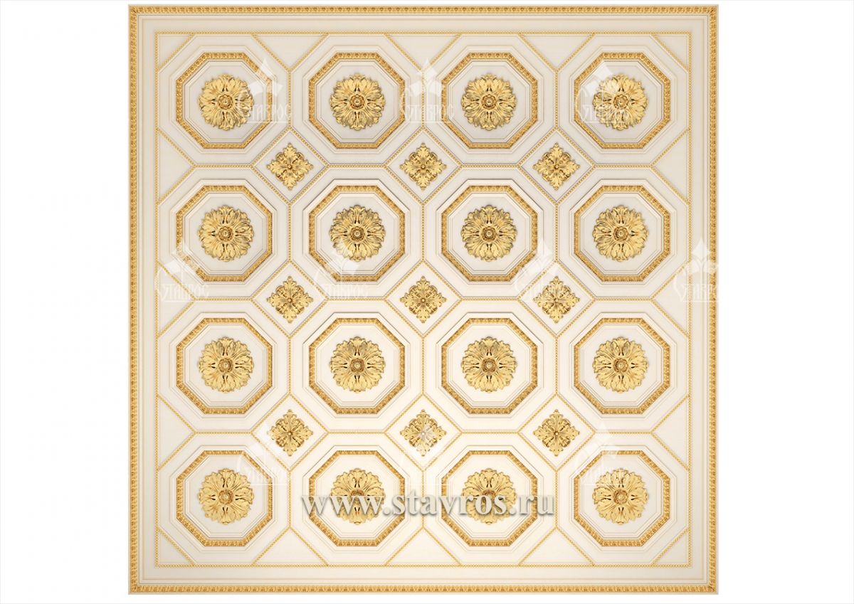 Carved ceiling RP-003 is the embodiment of elegance and aristocracy characteristic of the era of French classicism. The design, based on symmetrical hexagonal modules, is complemented by refined decorative elements that turn it into a central accent of any interior. The classic combination of white enamel and gold gives the ceiling a majestic appearance, making it not just a decorative element, but a true work of art.