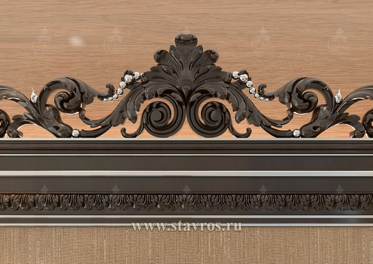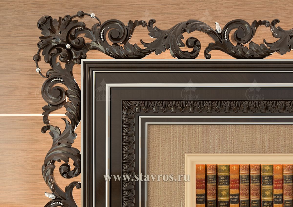 The upper part of the frame draws special attention, featuring a complex composition with a central accent in the form of a crowning element. This decorative element resembles Baroque stucco ornaments, creating an atmosphere of aristocracy and exclusivity.