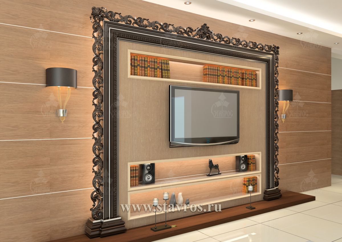 The decorative carved frame for TV RTV-001 is an exquisite design project for the TV zone, combining classic luxury, modern materials, and thoughtful functionality. This decor idea creates a harmonious composition in which the TV zone becomes a key element of the interior, highlighting the owner's high status and refined taste.