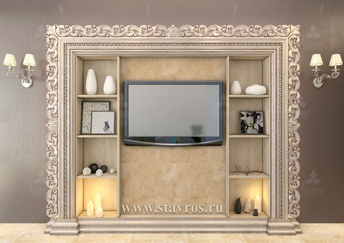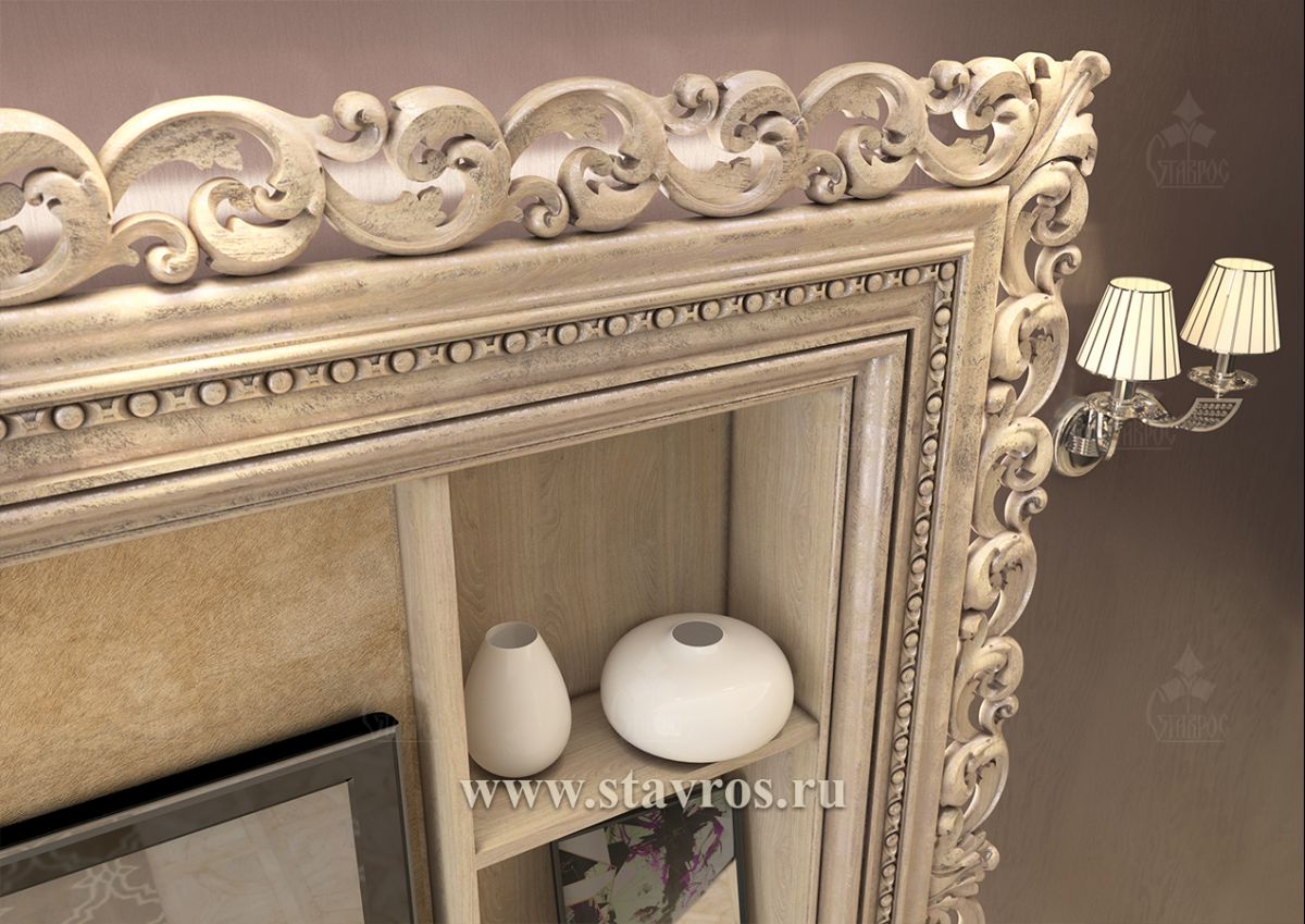 Creating a stylish TV zone – an important task in interior design, and the carved frame RTV-002 becomes a central accent that combines aesthetics and functionality. In this project, classical motifs, the lightness and elegance of carving, and the convenience of built-in shelves harmoniously blend together.