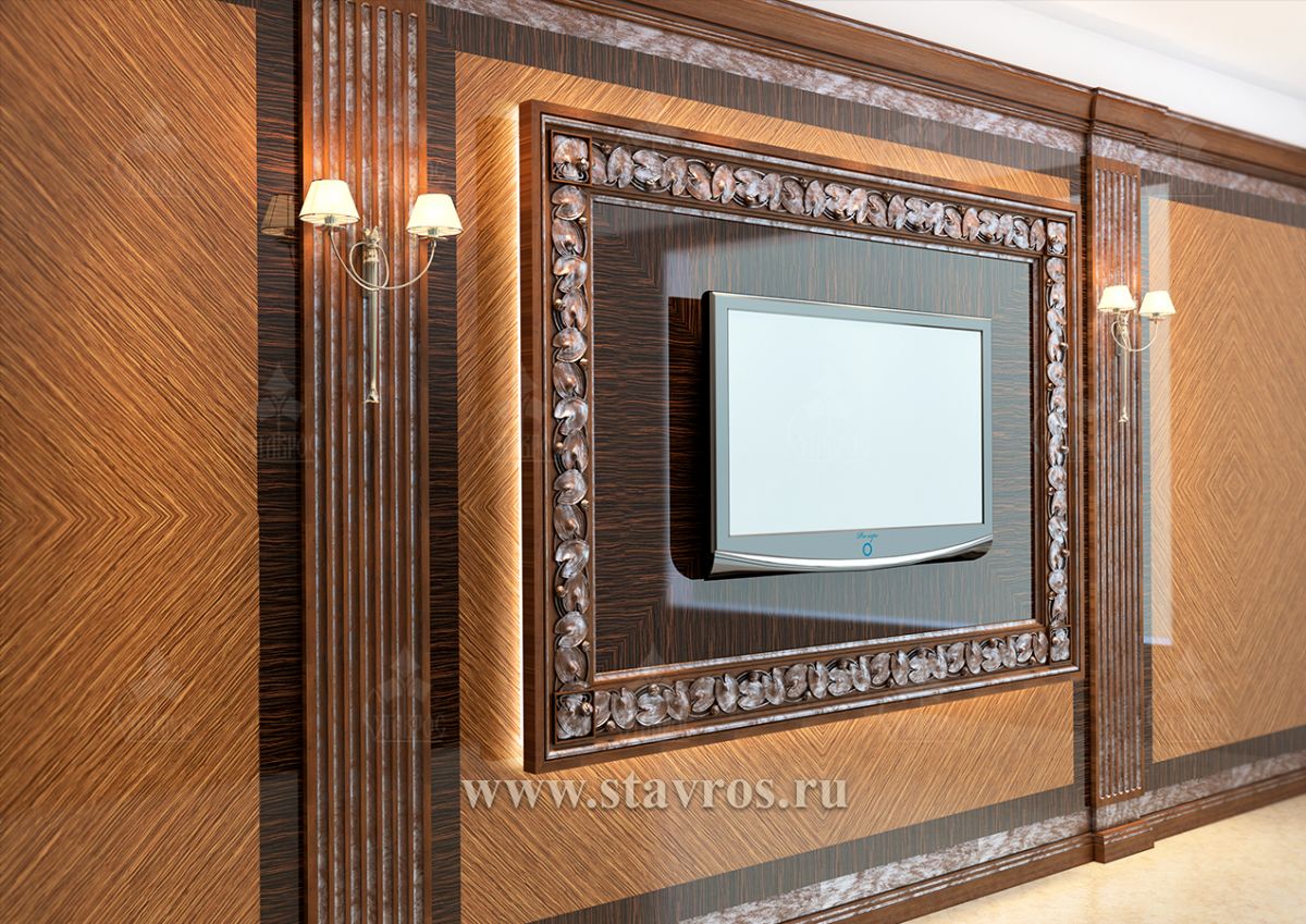 The carved frame for TV RTV-003 is an elegant combination of noble wood species, luxurious decorative carving ornament, and complex veneer texture. This composition is executed in the best traditions of classic design and is intended for decorating prestigious interiors, such as executive offices, living rooms, conference halls, home theaters, and luxurious apartments.