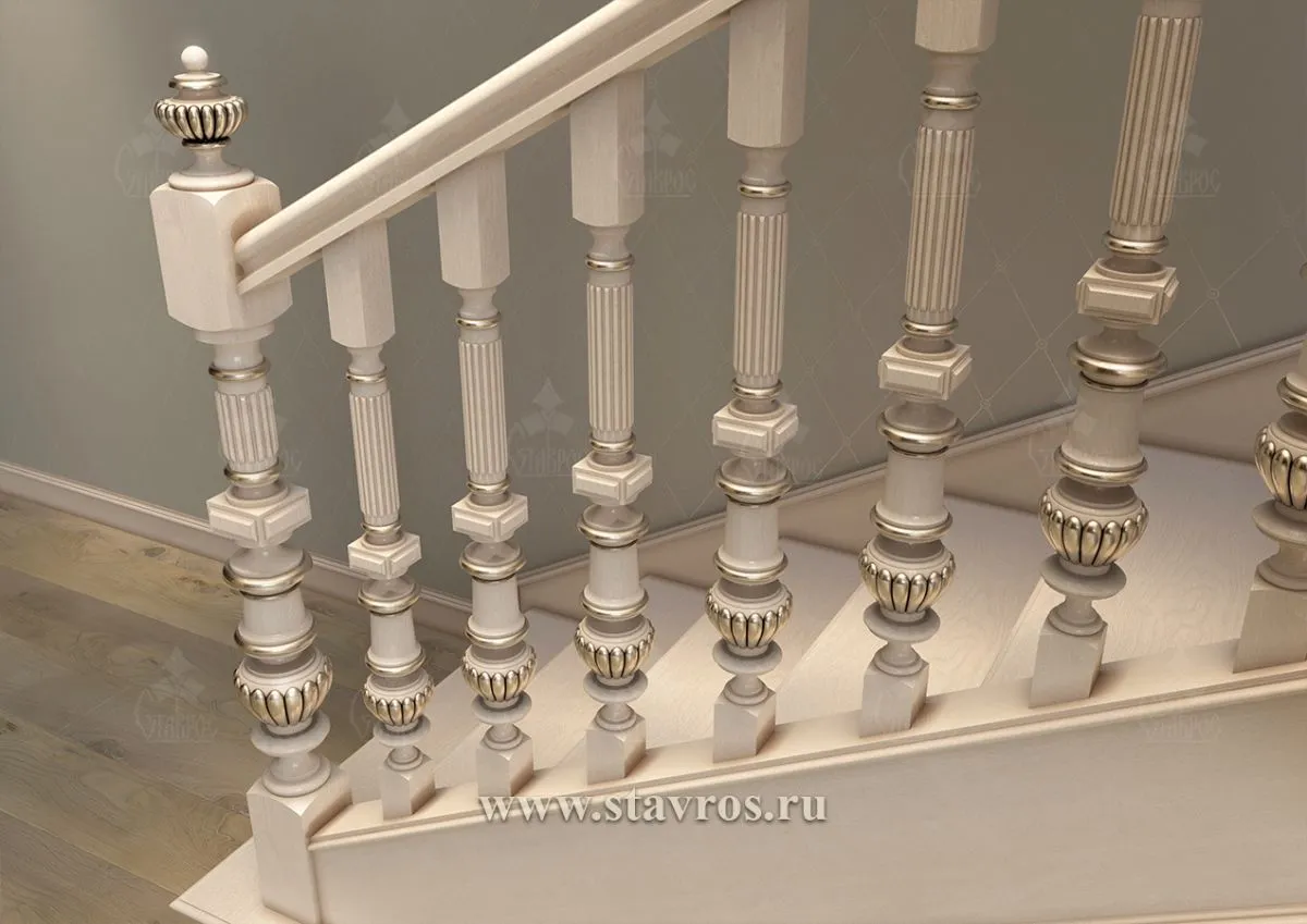 For staircase RLE-052, the following are used carved wooden balusters made from strong wood species. They undergo several stages of processing: