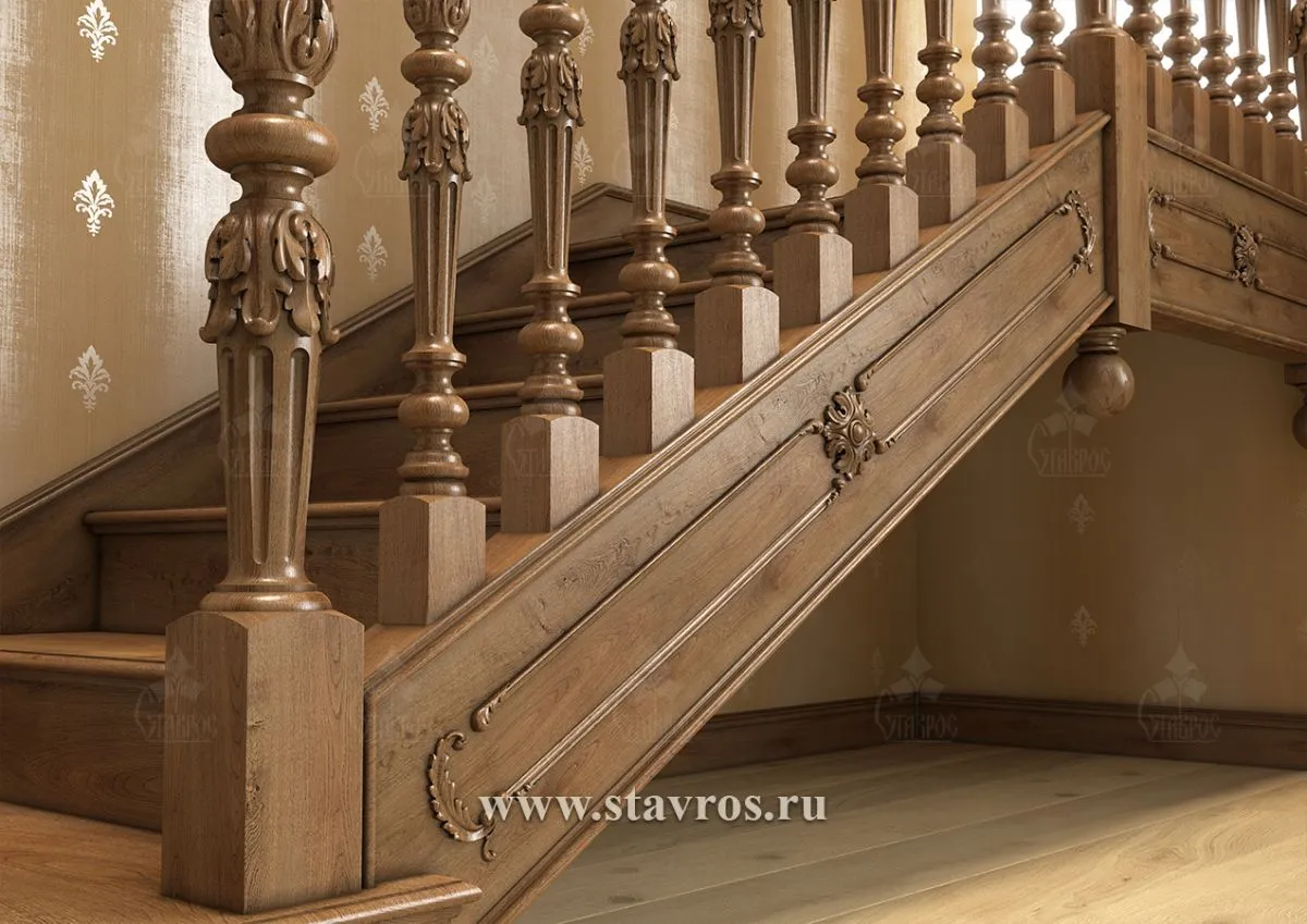 The design of the staircase RLE-055 includes intricate carved balusters, refined handrails and massive postselements, creating a sense of luxury and aristocracy. Special attention is paid to decorative elements on the stringers, making the structure not only reliable but also visually appealing.