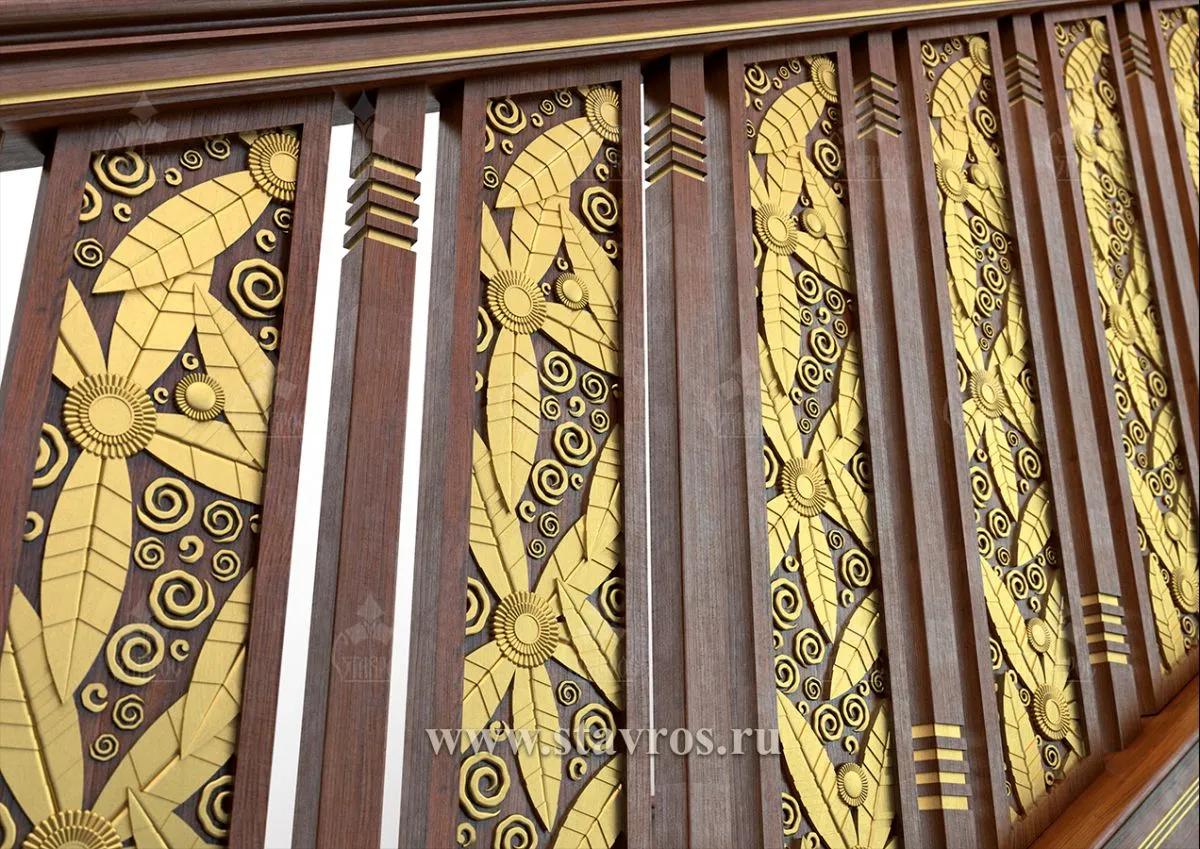 The pattern easily reveals delicate intertwining of plant ornaments, elegant floral elements, and geometric patterns, creating a sense of movement and depth. The unique combination of dark wood and gold inlays emphasizes the luxury of the structure, giving the staircase a status and elegant appearance.