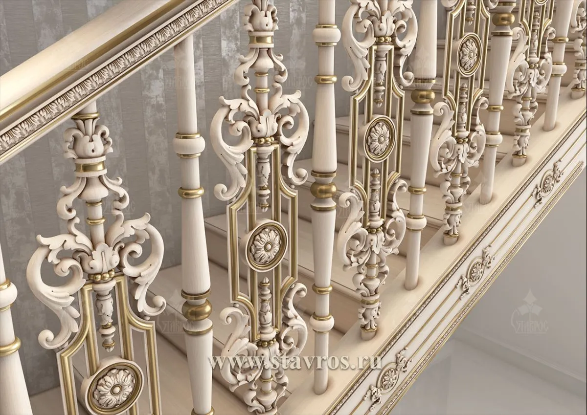 The foundation for the construction is the best Balusters for staircasemade from premium wood. Each baluster has a complex architectural form, including carved scrolls, volumetric decorative elements, and gold accents, creating a sense of refined aristocratic luxury.