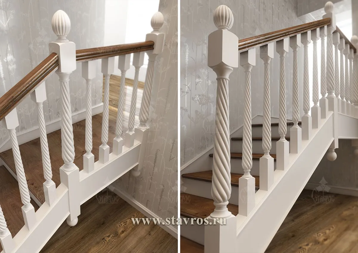 - Carving. Each baluster has a twisted pattern, making the staircase unique.