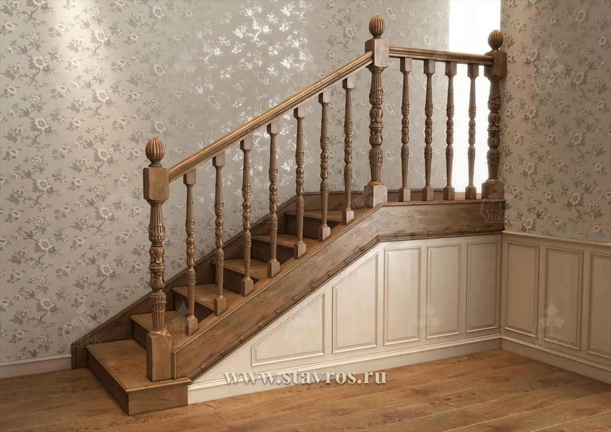 The main feature of the staircase is balusters with elegant hand-carved details. They harmoniously combine with solid handrails and reliable postscreating a cohesive architectural ensemble.
