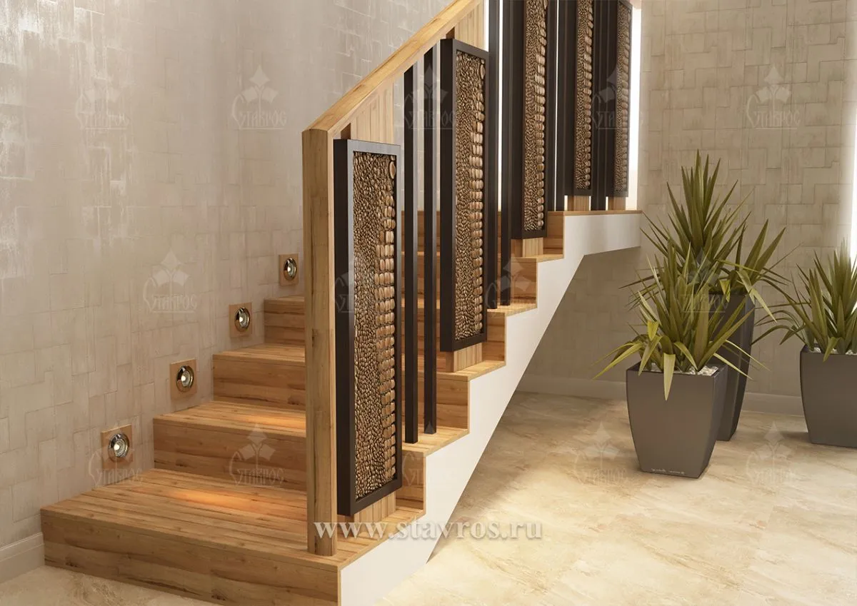 Each baluster is a unique construction consisting of vertical metal supports, between which carved panels are placed. These panels have a complex pattern that attracts attention and highlights the refined design of the staircase. Thanks to the use of metal in combination with wood, the baluster construction is not only aesthetically appealing but also durable.
